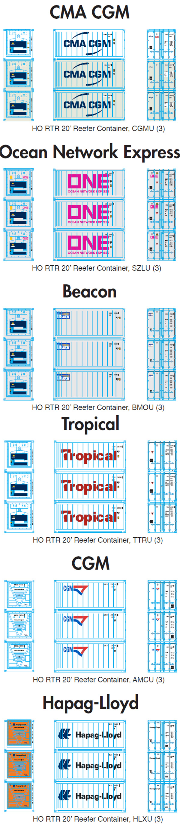 Athearn has announced a new production run of their 20' refrigerated container in the six paint schemes shown above. Delivery is scheduled for September 2021. [posted 10/06/2020]