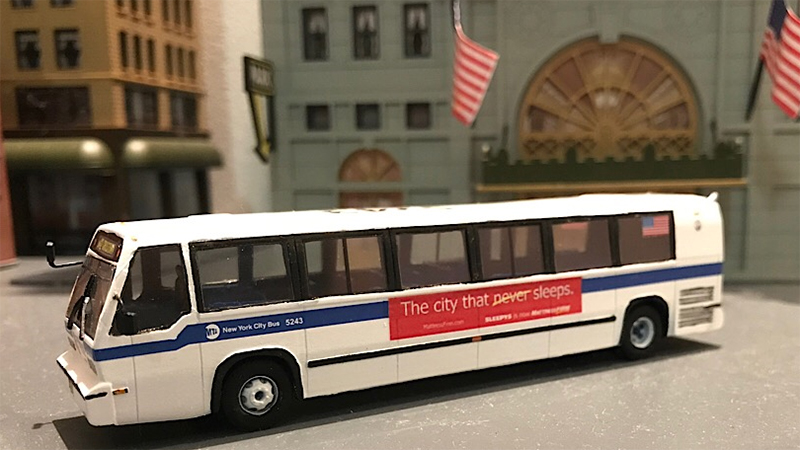 Markus Traeger is offering a resin kit for a GMC RTS transit bus with decals for New York City's MTA. Shown at top is a painted and completed model and above is the complete set of parts for the kit laid out. [posted 04/12/2021]