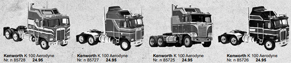 Brekina has announced 1/87 scale models of 1976 Kenworth K100 models in VIT trim with the Aerodyne raised sleeper roof. No color photos or even photos of the 1/87 scale versions are yet available. From left to right above, the color schemes are red/white, gray blue, blue/gray, and red/black. These are the perfect complement to the Peterbilt 359 models announced in our February New Products section. Walthers is showing delivery in June. [posted 04/03/2021]