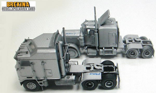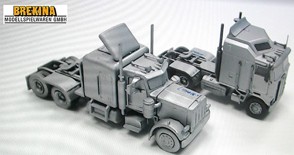 Brekina has released photos of test shots of the upcoming 1/87 scale models of 1976 Kenworth K100 models in VIT trim with the Aerodyne raised sleeper roof and Peterbilt 359 conventional with 60" sleeper. We are certainly looking forward to delivery of these this summer. [posted 04/21/2021]