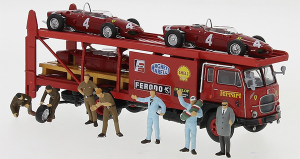 Brekina announced at the virtual 2021 Spielwarenmesse this Fiat 642 N2 racing transporter "Ferrari" (1962) with two Ferrari F 156 Formula 1 race cars and seven figures as shown above, of particular interest to fans of classic/vintage Formula 1 racing. [posted 02/01/2021]