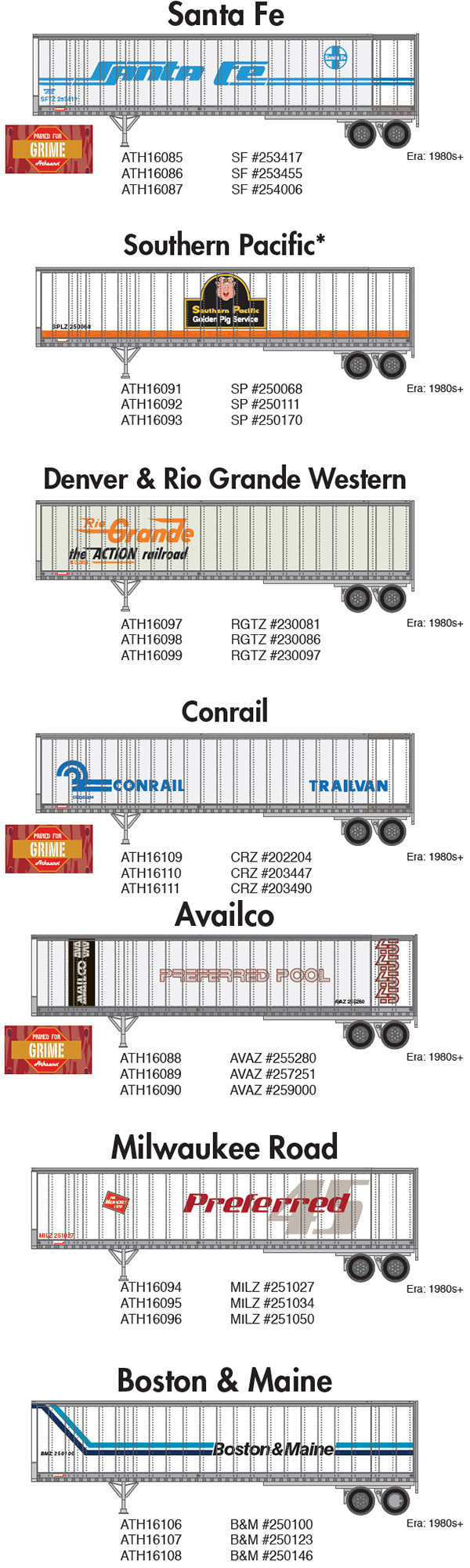 Athearn has announced a new production run of their 45' intermodal vans that represent stretched 40' trailers with added 5' section at rear in the seven paint schemes shown above. Delivery is scheduled for March 2022. [posted 03/01/2021]