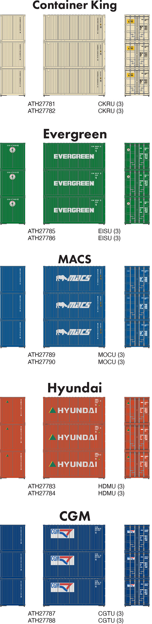 Athearn has announced a new production run of their 20' containers in the five paint schemes shown above. Delivery is expected in January 2023. [posted 01/01/2022]