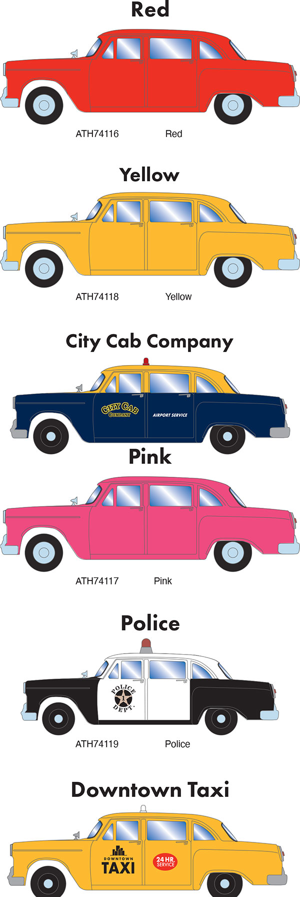 Athearn has announced a new production run of their Checker automobile in the six paint schemes shown above. Delivery is expected in January 2023. [posted 01/01/2022]
