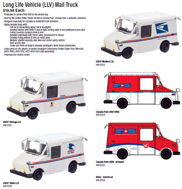 Walthers has announced an all new model of of the LLV postal delivery vehicle used by the US Postal Service and Canada Post since 1987. Each is available in paint schemes of various eras. Delivery is expected in this Winter. [updated 08/01/2023]