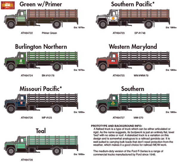 Athearn has announced a new production run of their Ford F-850 stake truck in the seven paint schemes shown above. [updated 05/03/2023]