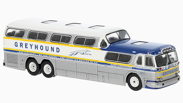 Brekina has shown these decorated samples of the GMC PD4501 "Scenicruiser" built exclusively for Greyhound from 1954-1956 in the three paint schemes shown above. The bus was used by Greyhound until the mid-'70s. [updated 05/25/2023]