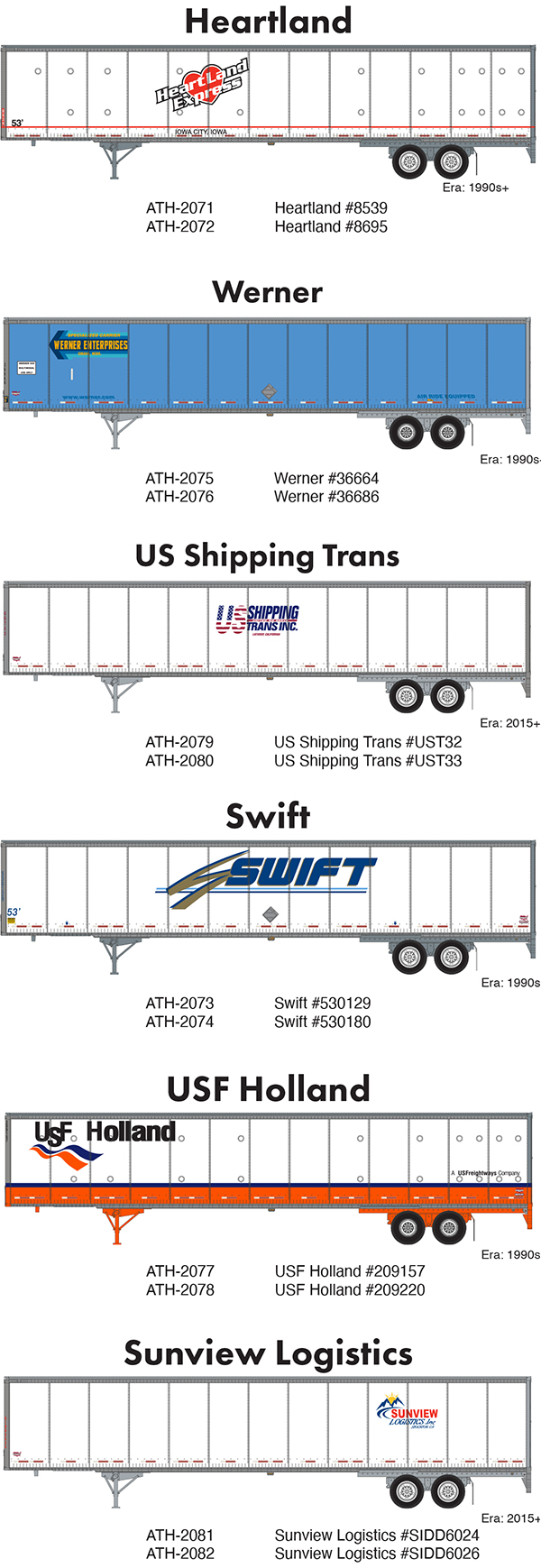 Athearn has announced a new production run of their 53' Wabash Duraplate van trailers in the six paint schemes shown above. Estimated delivery date is August 2025. [updated 04/09/2024]