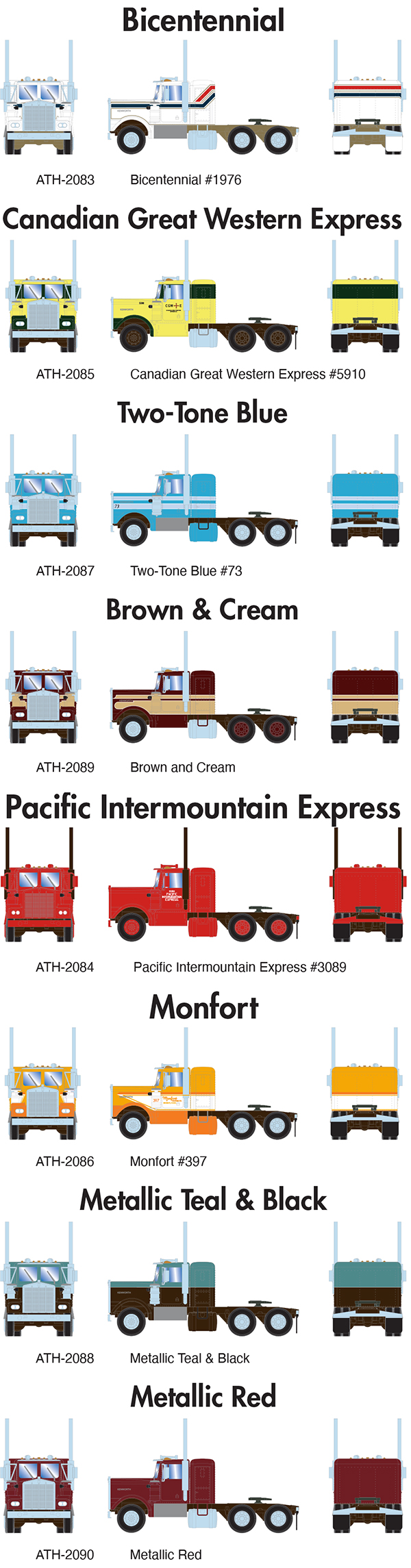 Athearn has announced a new production run of their Kenworth K100 truck tractors in the eight paint schemes shown above, including the ever popular Monfort paint scheme and the never before done Bicentennial scheme. Estimated delivery date is August 2025. [updated 04/09/2024]