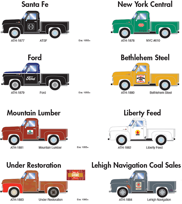 Athearn has announced a new production run of their 1955 Ford F series pickup in the eight paint schemes shown above. Estimated delivery date is June 2025. [updated 02/01/2024]