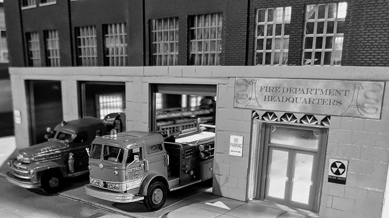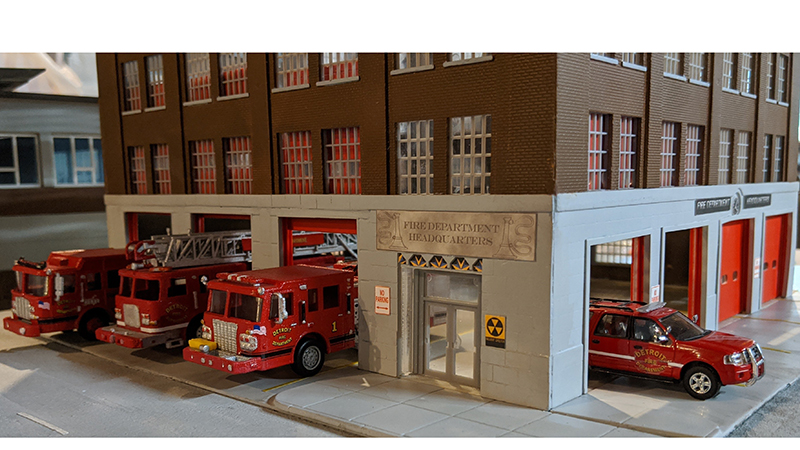 Larry Ward built this Fire Department Headquarters building from Walthers parking structure kits. The modern apparatus above were all built Mott Models 3D prints. Engine 1 is a 2015 Smeal, Ladder 1 is a 2000 Pierce 100' RM, Squad 2 is an HME, and Chief 1 is a Ford Expedition from River Point Station. The Mack below was built from a Ralph Ratcliffe kit and the Seagrave tiller was built from a Sylvan Scale Models resin kit.