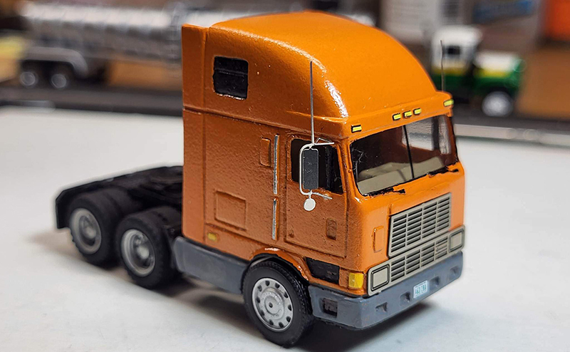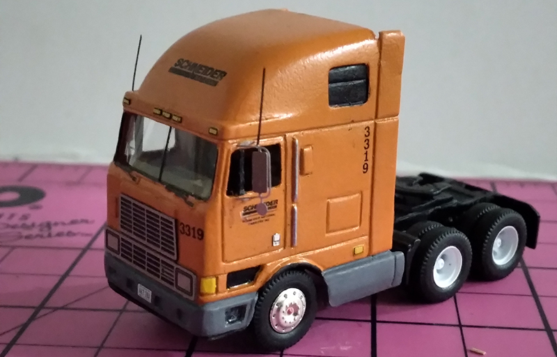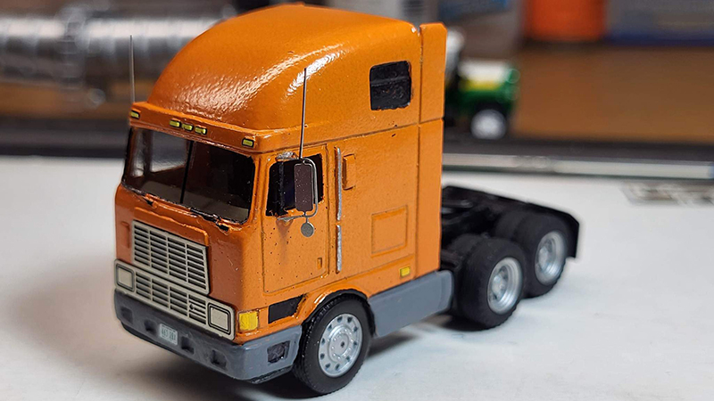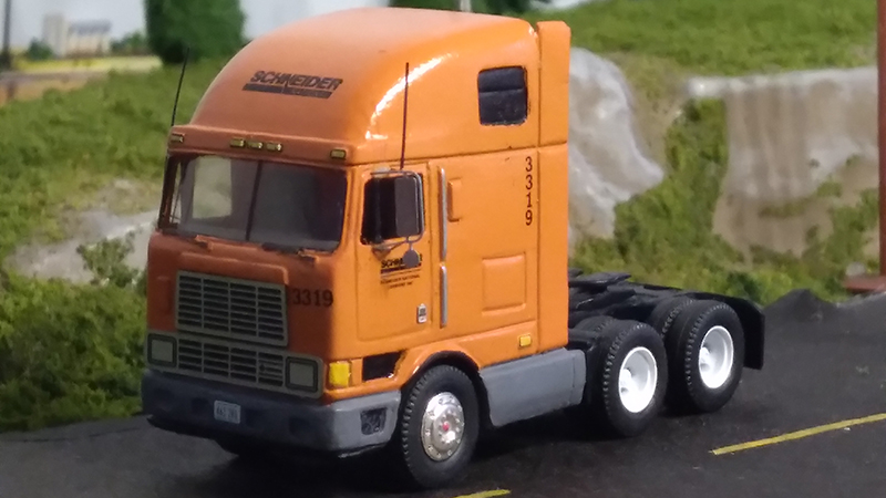 This International 9700 model built by Brad Hassler from a resin cab kit mounted on an Athearn Freightliner chassis (bottom two photos) for his friend Marty Uhlig. Marty added the decals and swapped the wheels as sen in the photos above and immediately below.