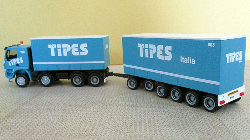 Jan Romijn built this Italian Iveco truck and trailer for steel coil transport. He reformed the chassis into an 8x4 configuration and the trailer he built himself from Evergreen styrene. The decals are from TL Modellbau and as you can see, a lot of parts from the spare box were used.