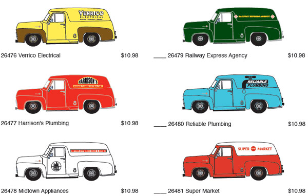 Athearn has announced the first commercial paint schemes on the 1955 Ford F-100 panel truck. These are generic paint schemes that should make model railroaders very happy! Delivery is expected in November 2007.