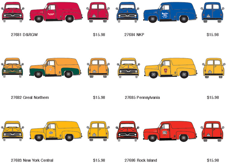 Athearn has announced a new release of their 1955 Ford F-100 panel trucks in the railroad paint schemes shown above. Delivery is expected in April 2011.