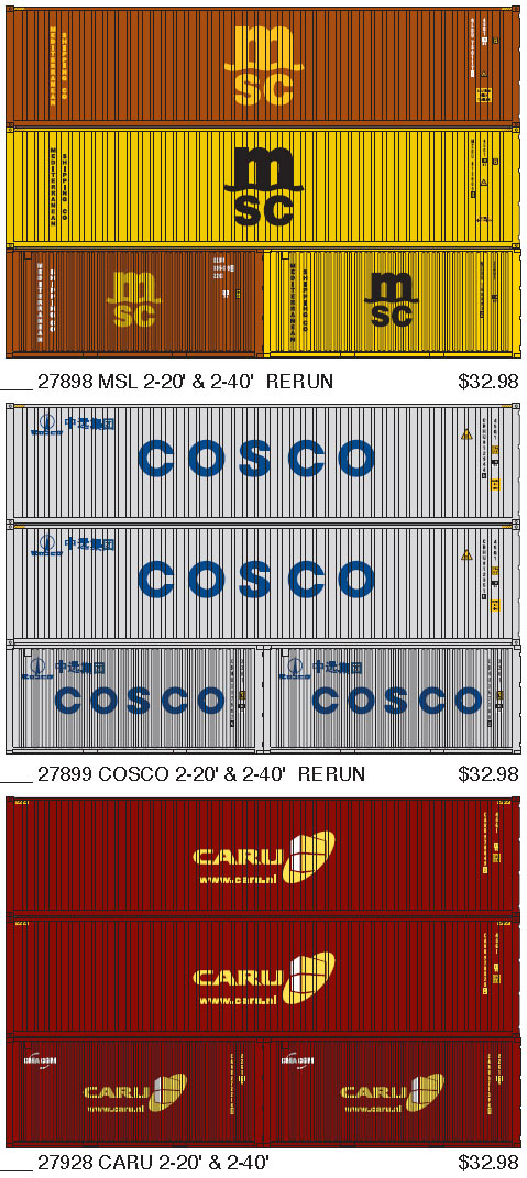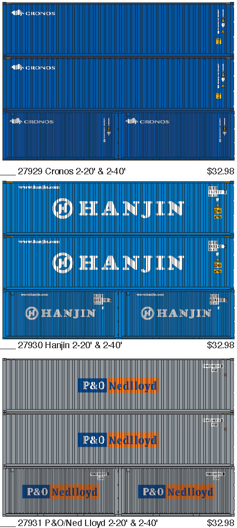 Athearn has announced a new release of 20' and 40' ocean container models (two of each length) in the paint schemes shown above. Delivery is expected in August 2011.