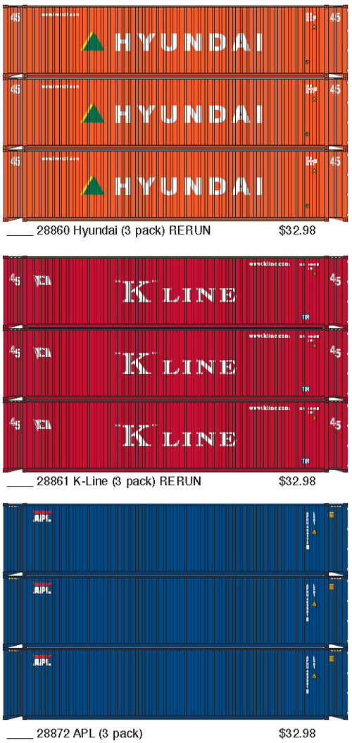 Athearn has announced a new release of 45' ocean container models (3 per package) in the paint schemes shown above. Delivery is expected in August 2011.