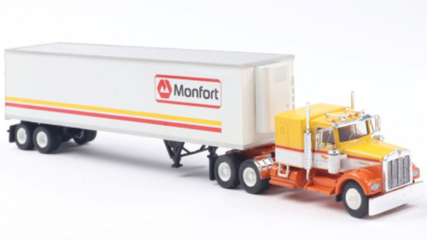 Brekina will soon be delivering their recently released Kenworth W900 truck tractor and 45' refrigerated trailer in two Monfort of Colorado schemes. Shown at top above is the original scheme and below it is the last scheme used before the company was acquired by Conagra in 1987. [updated 12/02/2025]