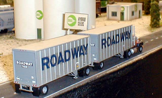 This view of Scott Kiefer's railroad layout shows the double pup trailers behind a Roadway Express Mack R600 truck tractor. Both trailers are A-Line Pines 28' exterior post trailers and A-Line decals.