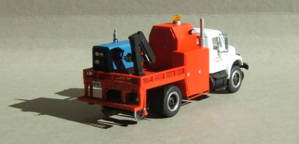 This model from Mike Pebesma is a hi-rail welding truck. It started with a Boley cab which was put on a scratchbuilt frame. The bed, tool cabinets, Miller "Big Blue Turbo" welder and the mini Hiab hoist were all scratchbuilt from styrene. The fine mesh used for the bed sides is copper shielding from old computer ribbon cable.The hi-rail wheels are made from N scale freight car wheels and can be moved to the road or rail position. It was painted using Pollyscale paints and decals from Microscale with Ontario licence plates from Penitentiary Products.