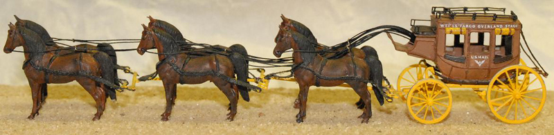 We always like to feature unusual 1/87 scale vehicle models and these latest photos of Rob Pav's Jordan Miniatures stagecoach certainly are out of the ordinary from the models we usually feature. It was built directly out of the box with some addtions. The reins are made of fine thread, the harness was made using black hockey tape. The horses are painted with two colors of paints and powdered chalk.