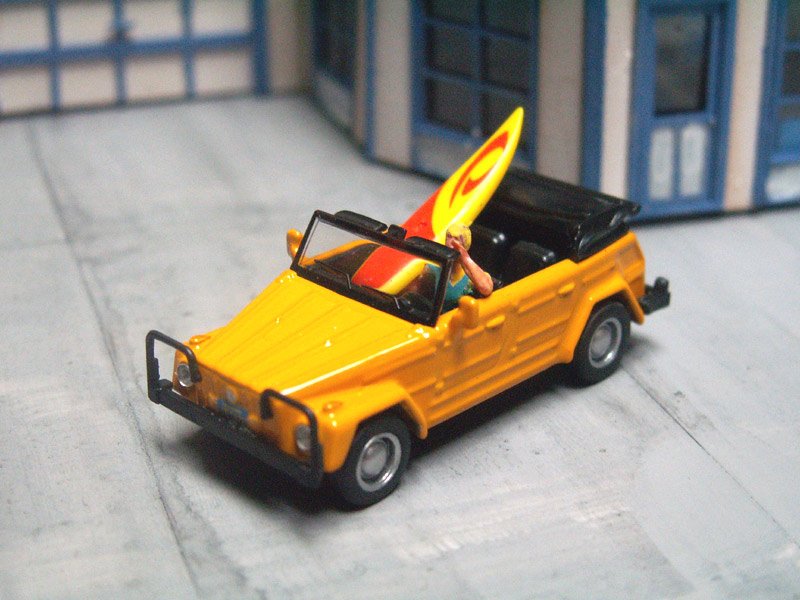 Erik Block detailed a Schuco die-cast VW Type 181 Kübelwagen model into a "surf buggy" for his L.A. scene with a surfboard in the car.