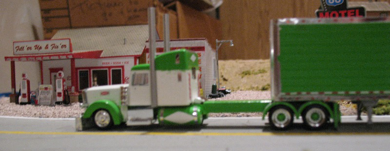 Mark Kulak refers to this model as "Slimed." It is a Herpa Peterbilt with scratchbuilt hood and Harley fenders as well as the steps and tanks. The cab was converted into a Unibilt cab with raised roof. The frame and fenders on the truck and trailer are from Promotex and the trailer is from Trucks N' Stuff. The wheels are from Herpa. The rest is just lots of chrome and lime green paint. The graphics on the tanks and trailer sides are from sign vinyl.
