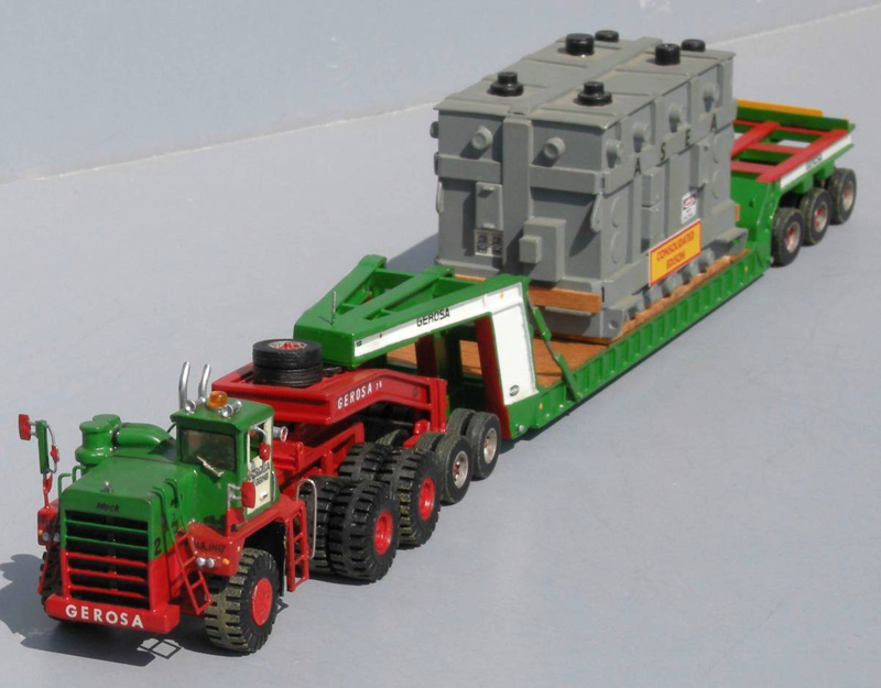 Ed scratchbuilt built this Gerosa Mack M75/100SX (a cross between the M75SX and M100SX) with dolly and heavy duty lowboy. The tractor, dolly, trailer and load are entirely scratchbuilt except for tires and wheels and detail parts. The dolly is ficticious as Gerosa never used a dolly with the big Mack.