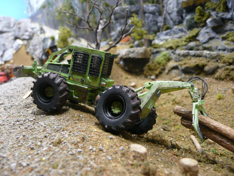 Dennis Raper converted a Resin Unlimited Franklin pulp-forwarder into a Franklin 170XL grapple skidder. He used the front half of the resin model and scratchbuilt the rear section including the grapple and boom. The resin model was made to turn in the middle. Dennis also made the frame oscillate and put clear plastic behind the screens to simulate the Lexan glass in the cab, added hydraulic lines to the grapple, changed the limb-risers and added Dennis Aust tires/wheels. Dennis also added planetaries on the wheels and of course, some grime and weathering.