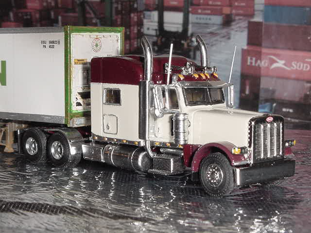 Jim Groeneweg built this 389 model using the Tonkin die cast model. Jim stripped the paint and applied one of his signature custom paint jobs! The refrigerated 40' container is an Athearn model on a kitbashed tridem container chassis that Jim heavily modified.