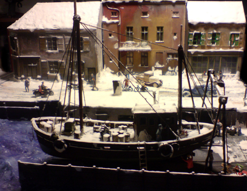 Here's another photo of Eric Vuyk's harbor diorama he built using Artitec ships and buildings, and a little shipyard, with autos from Ricko, Brekina, Herpa Minitanks, and Busch. The motorcycles are from Preiser and Artitec. Eric notes this was his first time working with snow in a diorama.