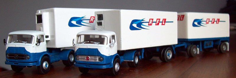 New Zealand modeler Ray Foot built these tow RFL Mercedes 338 truck tractors. Both were made from Brekina 338 Mercedes models. RFL ran a fleet of these trucks on long haul duties around New Zealand during the 1970s.