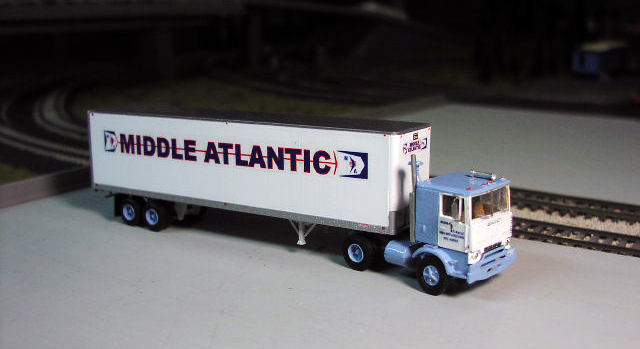 This Middle-Atlantic rig features an Ivers Engineering white metal GMC Crackerbox cab mounted on a Revell frame with Revell saddle tanks. Details include A-Line wheels, wipers, and mirrors. The exhaust stack/air cleaner are from Alloy Forms as is the brass air horn. The trailer is a 40' Athearn Fruehauf Z van. Ed O'Keefe decals are on both units.