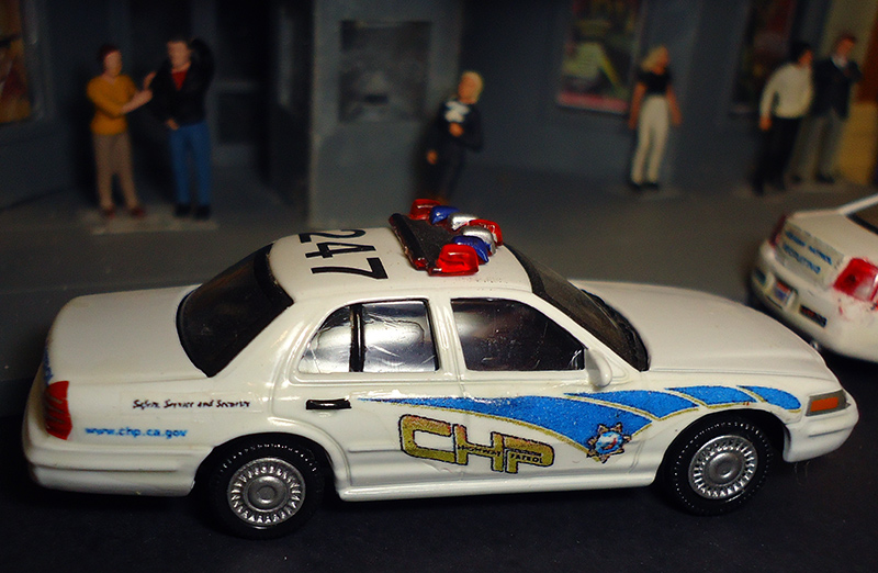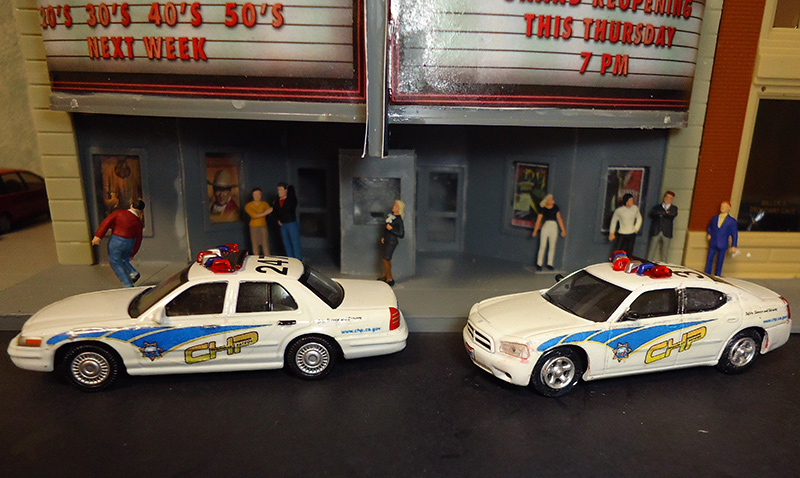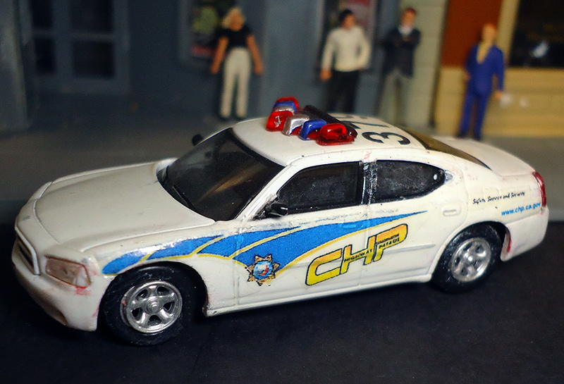 Jim Brown created these two California Highway Patrol recruitment vehicles using a Model Power Ford Crown Victoria (above left and below) and a Ricko Dodge Charger (above right and bottom) and his own custom decals.