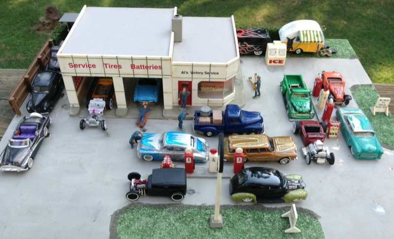 Here's more of Samuel Denehy's 1950s style gas station that's the refueling point for his custom cars and hot rods. It's made to look like as if the car guys were going to a car show and stopped to get gas on the way there. Previously featured in Photo Gallery 585.