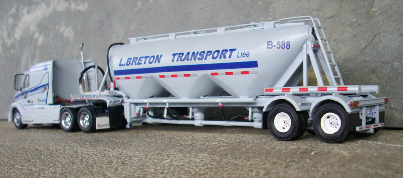 André Giroux built this Fruehauf design, 1000 cu ft aluminium pneumatic bulk trailer using one of his own trailer tank kits combined with an Athearn 40' container chassis, A-Line wheels and mud flaps, and additional miscellaneous accessories. Malo Transport, L. Breton Transport Ltée, and Transport Chalut 2000 are three affiliated Canadian transport companies involved in lime transport that use this style trailer. The truck tractor began as a Trucks N' Stuff Volvo VNL780. André modified the roof, the sleeper (new 42"), and fairings and enlarged the side windows. The new frame is from Promotex; the new model is a Volvo 42T630. André painted the truck and trailer, the decals are homemade.