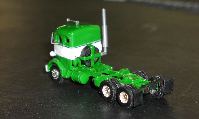 Fred Gruin built this Yukon Freight Lines model using an Ulrich Mack H63 truck tractor metal kit with Athearn wheels, Don Mills sander boxes, Ken Goudy stripes on the cab and bumper, Promotex ditch lights, and mirrors from the parts box. The trailer is a Walthers extendable container chassis with a 40' container with STS decals.
