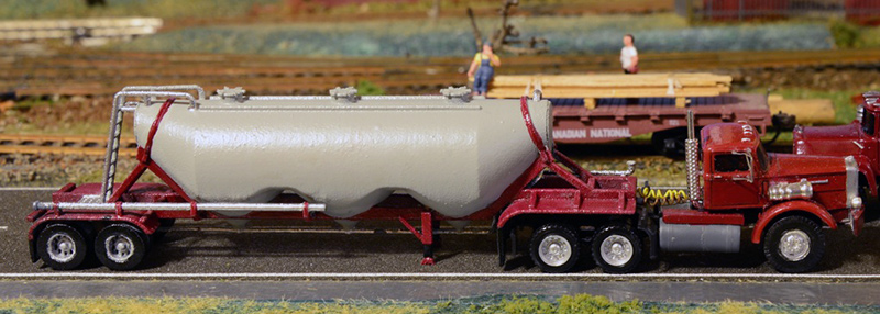 Here are photos of a pair of Shapeways 3D printed pneumatic bulk trailers built and finished by John Soehner. The trailers are hooked to a Mack RB600 (above, right and below) and an Autocar DC10264 (above, left and bottom). The Mack RB600 was built using a Ralph Ratcliffe Models resin cab mounted on a Boley chassis. The Sheepscot Autocar DC97 resin cab is mounted on a Herpa chassis with various parts from the spare parts box. The photos were taken on The Motel Module, a John Allen inspired HO model railroad switching puzzle with Route87 roadway on the front edge!