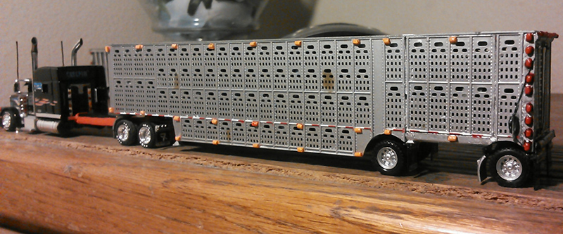 This is another of Dallas Bishop's livestock hauling fleet. This spread axle trailer was built by splicing two Promotex livestock trailers. The Pete 389 truck tractor is a customized Trucks N' Stuff/Tonkin model.