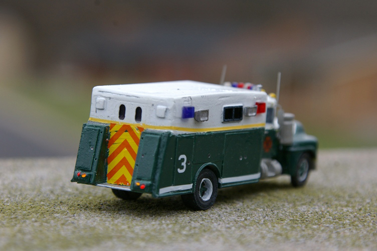 This Mack/Pierce walk-in rescue decorated with a fictional fire department was built by Jim Balogh using a cab is from an old Walthers resin kit of a Mack R truck tractor. The rescue body is from an Alloy Forms Ford/Pierce rescue. The body has seen many make overs over the years which eroded a lot of the cast details. This is its final configuration. The wheels, scene lights, and mirrors are also Alloy Forms. Jim says the light bar has been in the parts bin for so long he can't remember the manufacturer. The chevrons on the rear of the body are from Microscale; Florida East Coast Railroad locomotive stripes laid over yellow trim film.