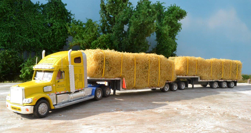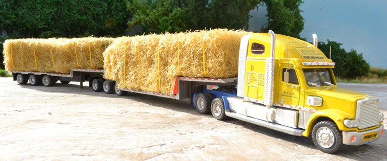 This Freightliner Coronado B-Train is running for a fictitious company. In Alberta (Canada) trucks are used to transport hay to feed cattle and horses and sometimes they have pretty big loads. Günter Storch created the company Alberta Low Loader Service to use all that pretty yellow colored trucks so they only need a blue frame.