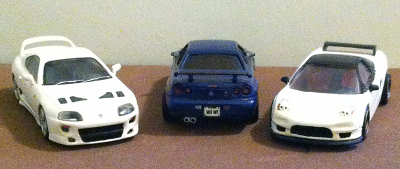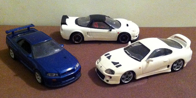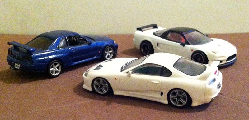 Jorge Salazar sent us these photos of his three beautiful Japanese cars, the Toyota Supra from Kato, the Honda NX-R from Trumpeter, and Nissan Skyline R34 from Doyusha. The Toyota and Honda were modified to give a sportier image. The R34 features a new windshield and interior. All three cars have new wheels and added details.