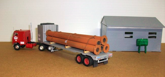 Ron Britton built this Athearn Freightliner that he disassembled and then built back with added custom bumper, A-Line mirrors, license plate holder, fuel tanks moved up, and a new paint job. The trailer is custom built by Bob Sundstrom. Graphics are Lonestar Models recently released C&H decals, pipe load from an HO model railroad flat car load, and chains added for affect.