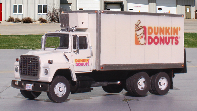 Marcel Devlieger built this Dunkin' Donuts delivery truck using an Atlas Ford LNT-9000 cab and a Custom Finishing Models box body. All corners on the body and bumpers are polished. Marcel added jewels for headlights and taillights and an operating tailgate. He also made the custom decals.