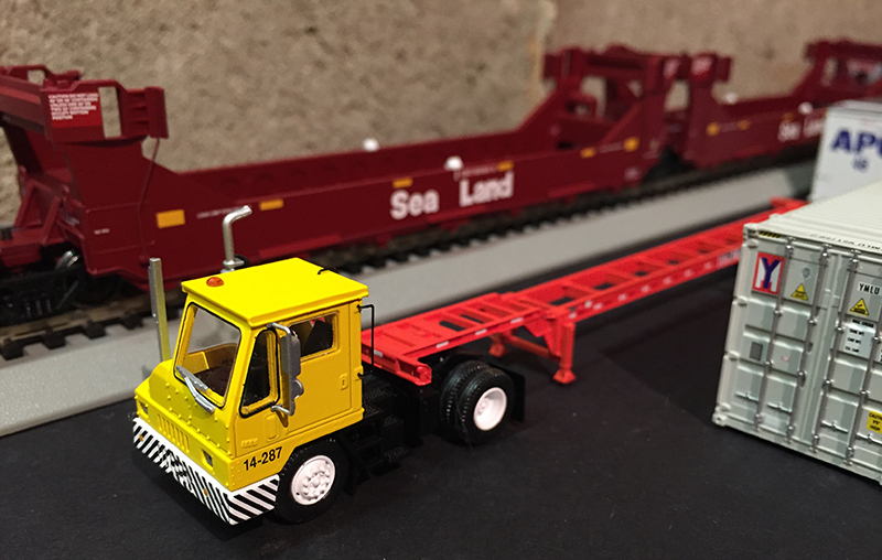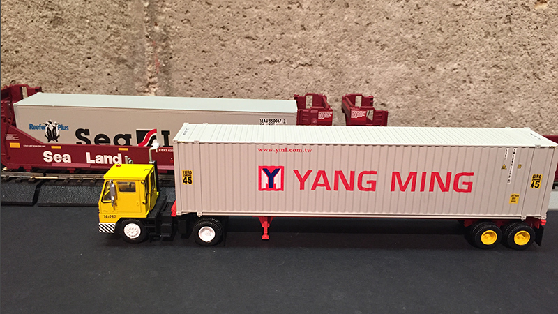 Mark Baske submitted these photos of his railroad intermodal scene that includes an Athearn yard tractor in Safety Yellow with chassis and 40' Yang Ming container by Athearn as well.