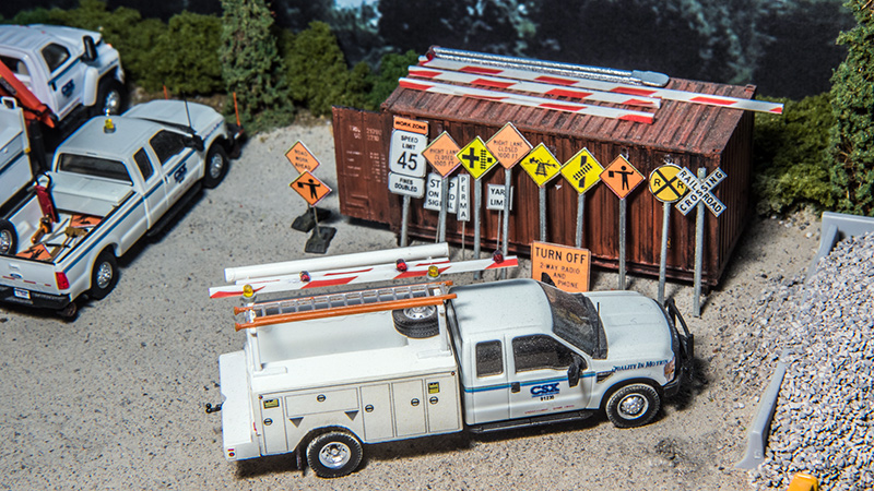 Here another of the many small vignettes on Jesse Weigand's Route87 module set he had on display at the 2016 East Coast Meet in W. Springfield, MA January 30-31, 2016. The Ford F-350 extended cab truck in the foreground is a River Point Station model with custom service bed and RPS ladder rack. The extended cab Ford F-350 hi-rail truck on the left features one of RPS' toolboxes and plenty of added details in the bed. Details are from a variety of sources.