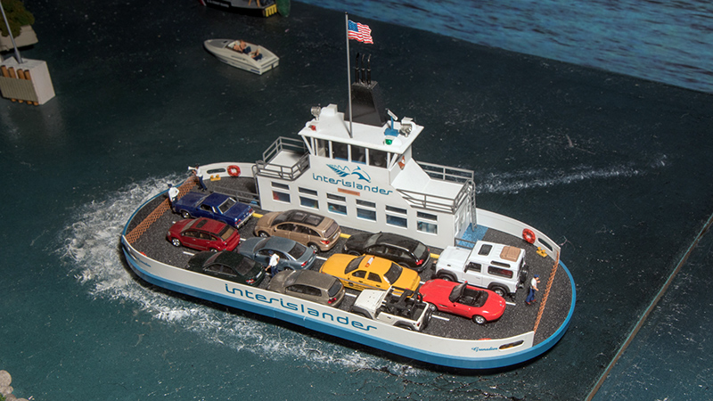 This Interislander car ferry was displayed by Glenn Williams at the 2016 East Coast Meet in W. Springfield, MA January 30-31, 2016 one of the modules that was part of his 24' long series of modules. The ferry and loading dock are completely scratchbuilt. Vehicles are from a variety of manufacturers.