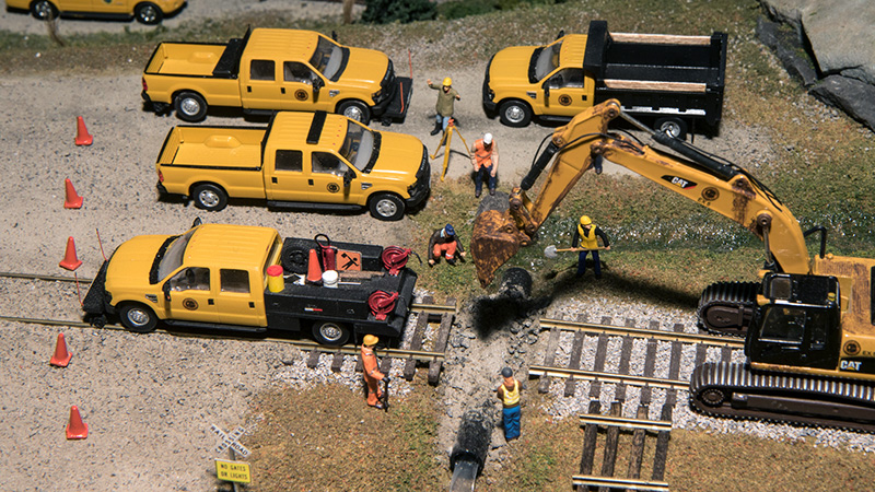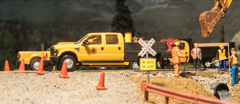 This scene is one of the many detailed scenes on the Route87 modules Jesse Weigand had on display at the 2016 East Coast Meet in W. Springfield, MA January 30-31, 2016. The Ford pickups and dump trucks were all built using River Point Station models. The Caterpillar excavator model is a weathered Norscot model.