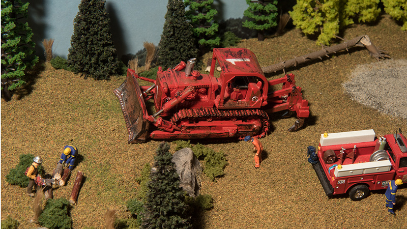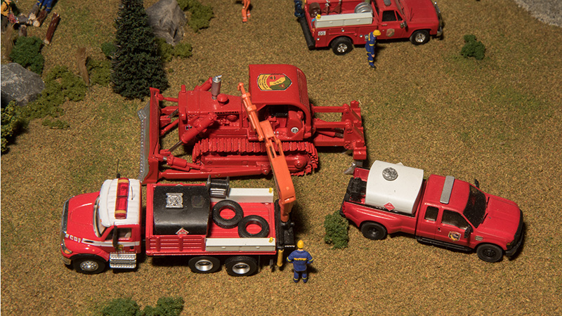 Ian Cooperstein had this pair of International Harvester TD-25 fire dozers on one of his modules displayed at the 2016 East Coast Meet in W. Springfield, MA January 30-31, 2016. Both dozers are First Gear die-cast models. The Chevrolet service truck is a custom painted Trident model, the Ford dually pickup is from River Point Station and customized, and the stakebed International 7600 is a modified Boley model.