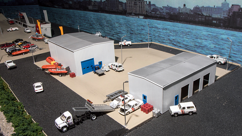 One of the more remarkable displays at the 2016 East Coast Meet in W. Springfield, MA January 30-31, 2016 was a magnificent 24' long series of modules built and presented by Glenn Williams. This module depicts a United States Coast Guard maintenance facility. Automobiles and light trucks are from Trident, Busch, and River Point Station. The GMC rollback recovery vehicle is from Walthers/Boley.
